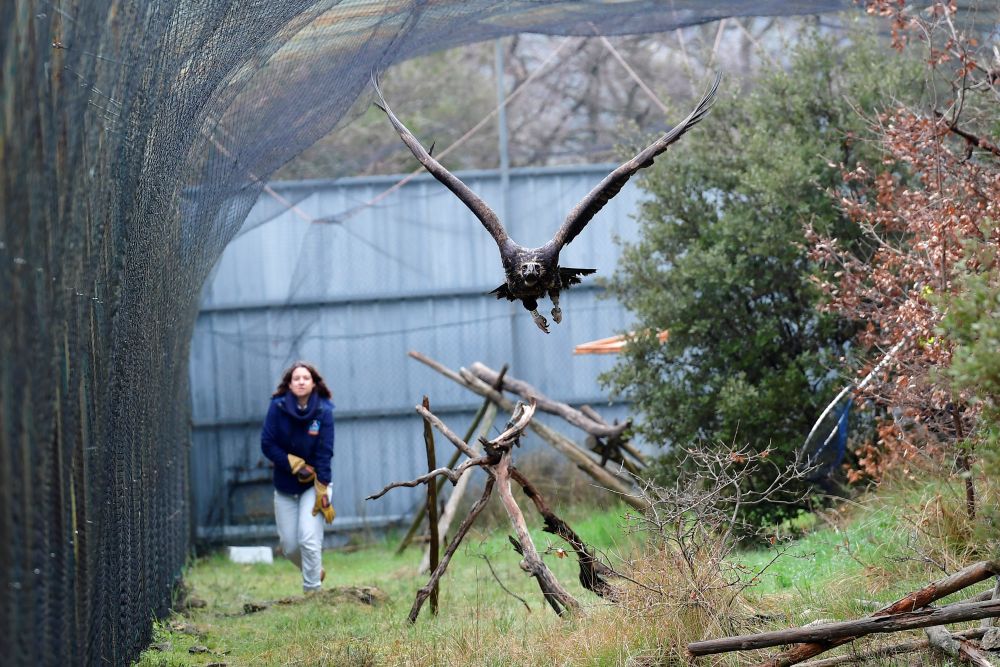 Après avoir repris des forces et retrouvé davantage de mobilité dans sa patte, ILD a été transférée dans une grande volière pour sa rééducation. Celle-ci était déjà occupée par deux autres congénères. Il importe de souligner qu’avoir autant de Vautours moines en soins en même temps est tout à fait exceptionnel : depuis l’ouverture du Centre de sauvegarde en 1996, nous n’avons accueilli que sept Vautours Moines, dont quatre dans la dernière année !