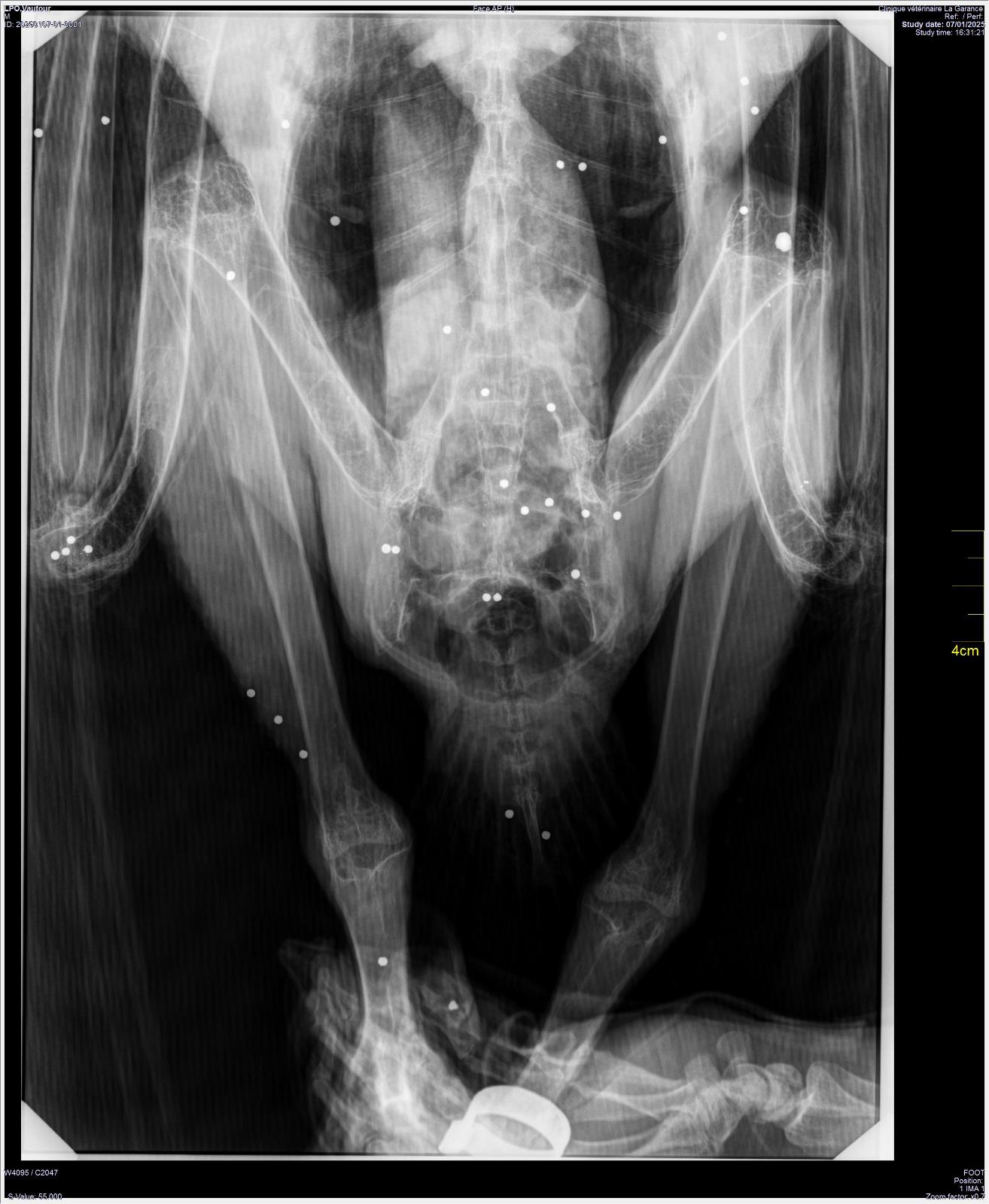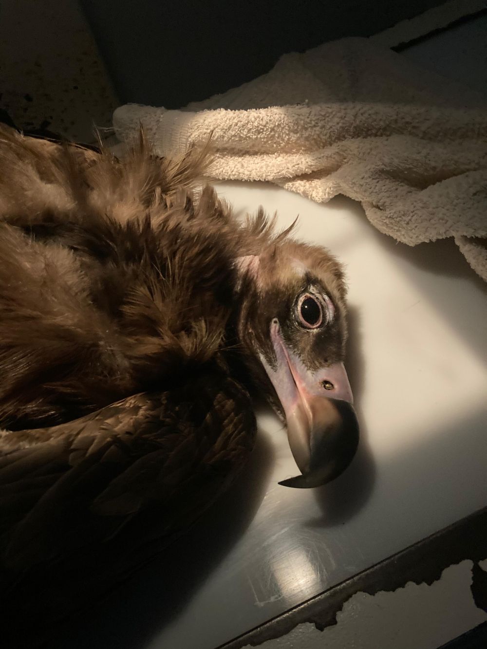 Au début du mois de janvier, nous avons accueilli un Vautour moine en détresse, une espèce très menacée en France. Trouvé gisant au bord d’une rivière dans les Alpes de Haute Provence, le grand rapace est arrivé extrêmement affaibli au Centre de sauvegarde. Victime d’une importante hémorragie interne, il ne pouvait pas prendre appui sur sa patte gauche et avait un œil injecté de sang. Une radiographie a révélé la cause de ces maux, mais aussi la gravité de son état : son corps était criblé de plombs. Aucune partie n’avait été épargnée : tête, ailes, corps, pattes. Au total plus d’une soixantaine de plombs, ce qui laisse supposer un tir à proximité.