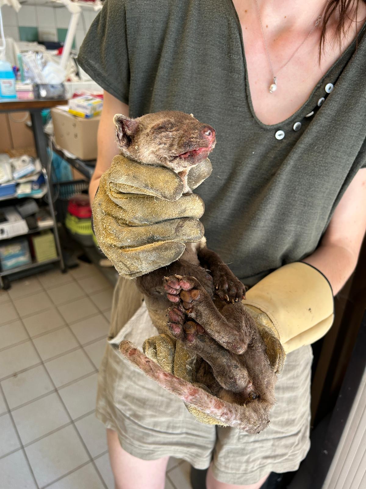 Il y a tout juste une semaine, nous avons accueilli au Centre de sauvegarde une jeune fouine rescapée du violent incendie de Marseille du 8 juillet. L’animal, d’ordinaire vif, à la queue touffue, au regard curieux, était méconnaissable. Elle avait les yeux collés, des traces de brûlures sur le bout des oreilles et des pattes, son pelage était ras, sa queue un maigre cordon de plaies. Elle a été immédiatement placée en soins intensifs avec comme priorité sa réhydratation, le soulagement de la douleur et le soin des plaies. Malheureusement, elle a succombé à ses blessures peu de temps après son admission.