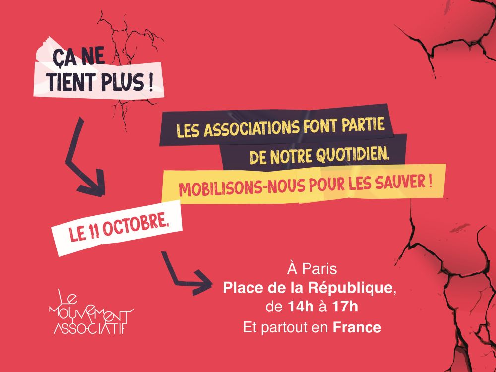 Le 11 octobre prochain, une grande mobilisation du monde associatif se déroulera à l’initiative du Mouvement associatif, sous le mot d’ordre « ça ne tient plus ! ». Cette action a pour objectif d’alerter les pouvoirs publics sur les difficultés croissantes que rencontrent les associations, particulièrement depuis quelques mois, et dans la perspective du nouveau débat budgétaire au Parlement.