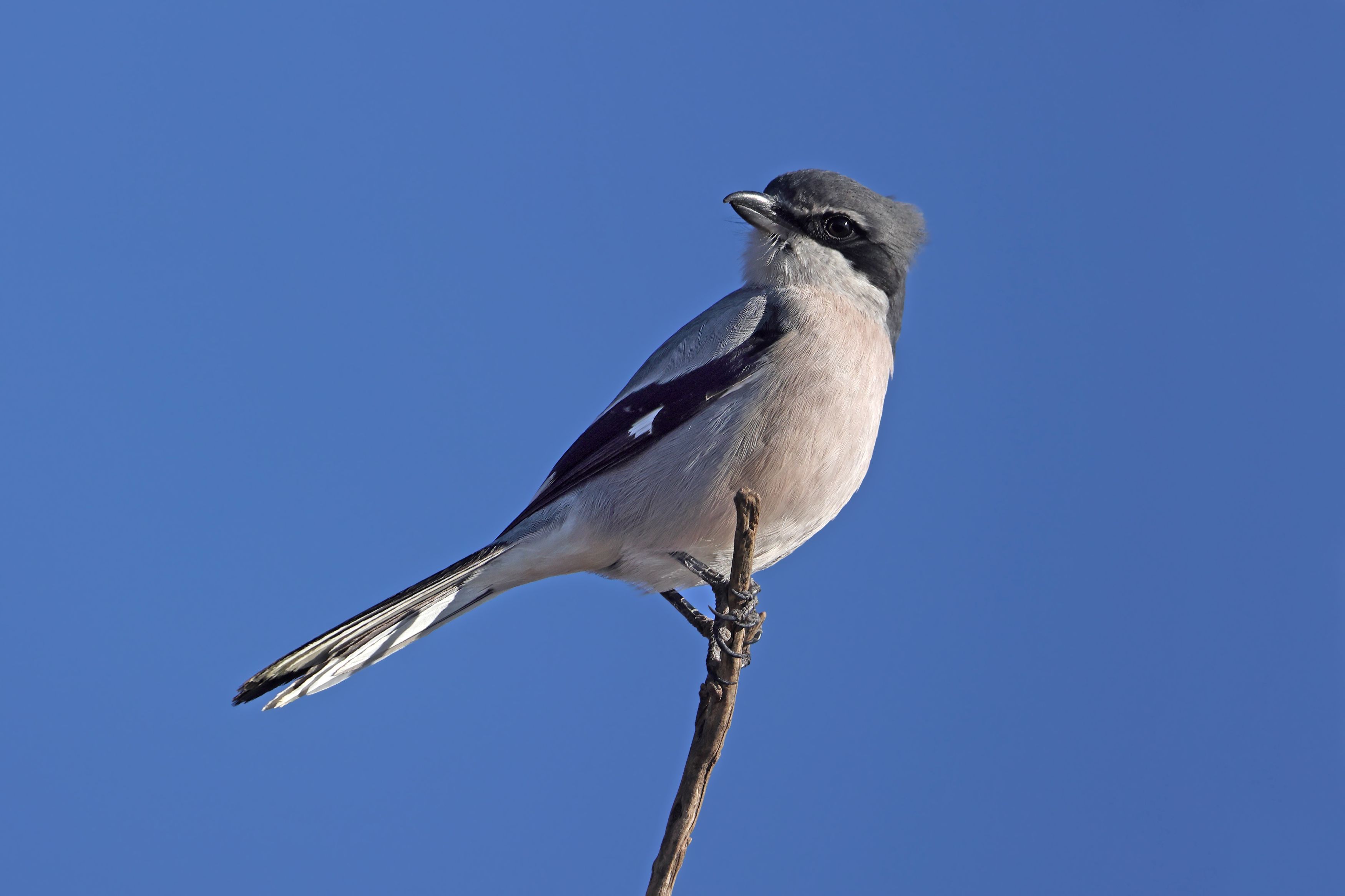Plus grande que les autres (22 à 26 cm), la Pie-grièche grise se distingue par son dos gris perle, ses ailes noires et son dessous blanc.