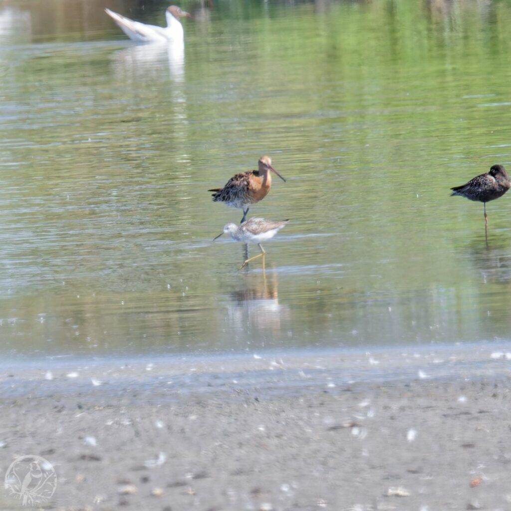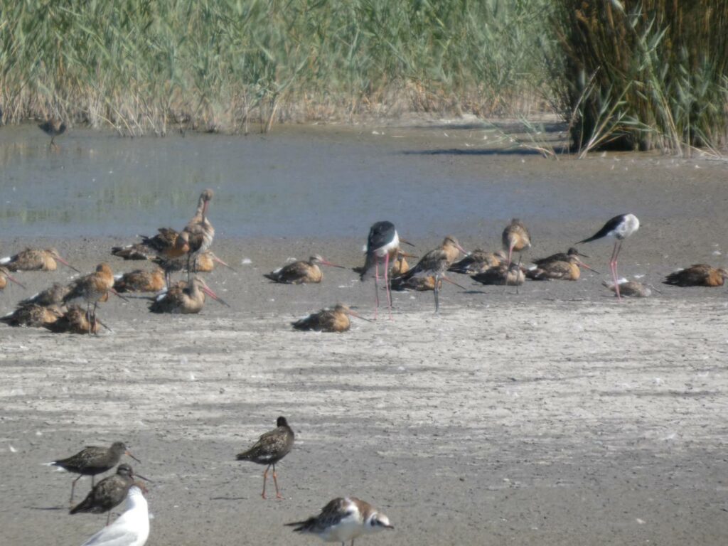 Côté Laridés, sternes hansel, sternes pierregarins, sternes naines pêchent ou se reposent. Un chevalier stagnatile se faufile, silhouette grêle au milieu des arlequins et gambettes plus trapus.