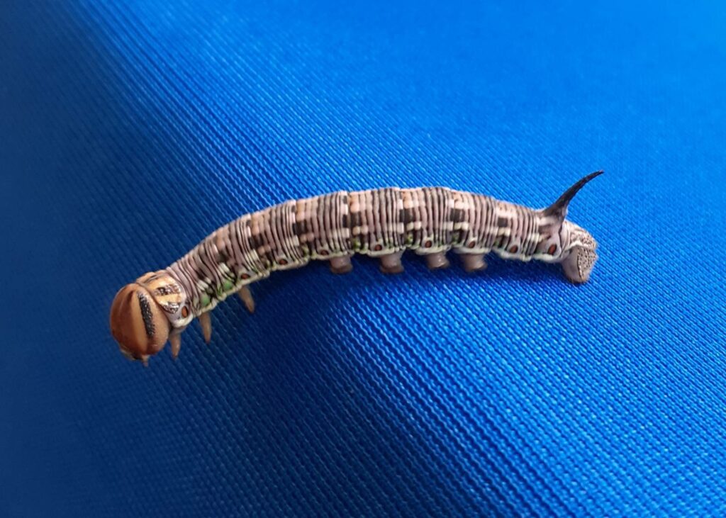 Une belle chenille tombée des conifères nous surplombant est venue faire un tour sur la nappe LPO. Chenille du sphinx du pin ou du sphinx mauresque, indiscernables à ce stade, mais plus probablement du sphinx mauresque qui domine dans le sud-est de la France. Sans doute cette chenille, au dernier stade larvaire, cherchait elle à s’enfouir avant de se transformer en chrysalide pour une métamorphose en imago au printemps.