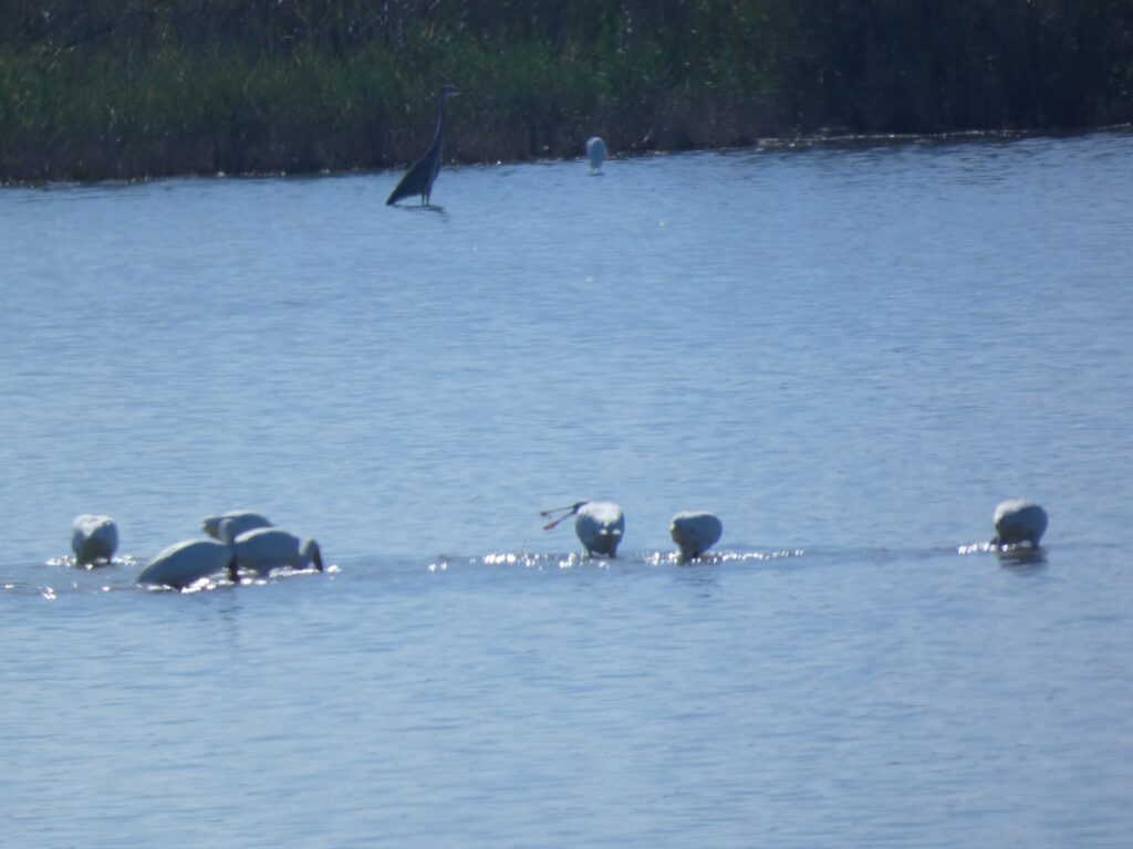 Dans les hauts fonds, chevaliers gambettes et chevaliers aboyeurs vont et viennent parmi les flamants roses. Côté laridés des sternes Caspienne croisent devant l’observatoire et plongent de temps à autre.