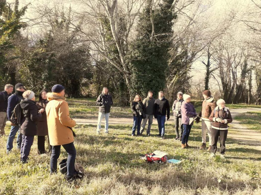 Sous les grands peupliers du parc municipal de la ville de Sorgues, les participants ont appris à reconnaître, par la vue et l’écoute, quelques uns des oiseaux des jardins : fauvette à tête noire, merle noir, rougegorge familier, mésange charbonnière, mésange bleue, grimpereau des jardins, pinson des arbres, pigeon ramier, et quelques autres de passage comme le grand cormoran, la mouette rieuse et le goéland leucophée. Un pic épeiche est passé furtivement et une grive mauvis est venue profiter des premiers fruits du lierre, reconnaissable à son sourcil blanc et ses flancs roux.
