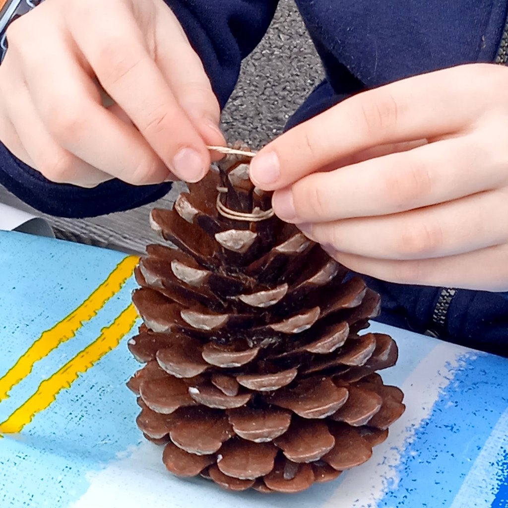 La recette. Attacher une bonne longueur de ficelle à la pomme de pin,