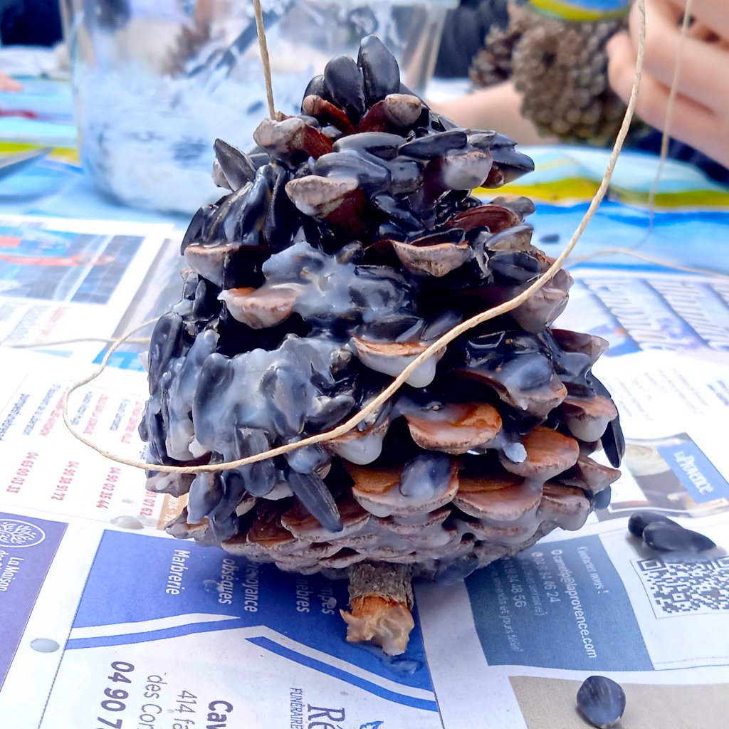 Les ingrédients : pommes de pin bien ouvertes, végétaline (surtout pas de graisses animales), graines de tournesols, de la ficelle, une paire de ciseaux, des saladiers et des cuillères ou spatules. Et bien sur toiles cirées, vieux journaux pour protéger les tables !