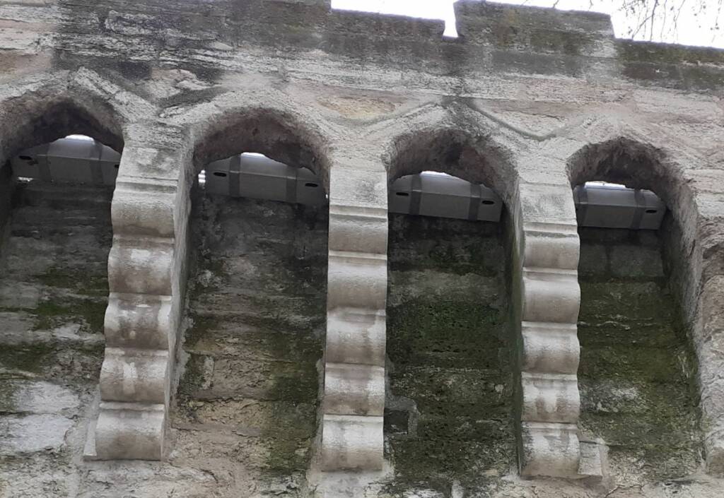 Vu d’en bas, les nichoirs sont très discrets. La hauteur du rempart garantie des conditions optimales pour le premier vol des jeunes martinets.