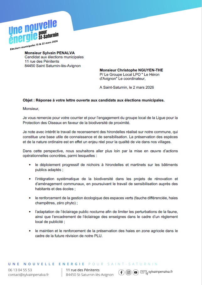 A ce jour, vendredi 13 mars 2026, nous avons reçu une réponse de Monsieur Sylvain Penalva, candidat à Saint-Saturnin-les-Avignon, que nous reproduisons ici avec son autorisation.