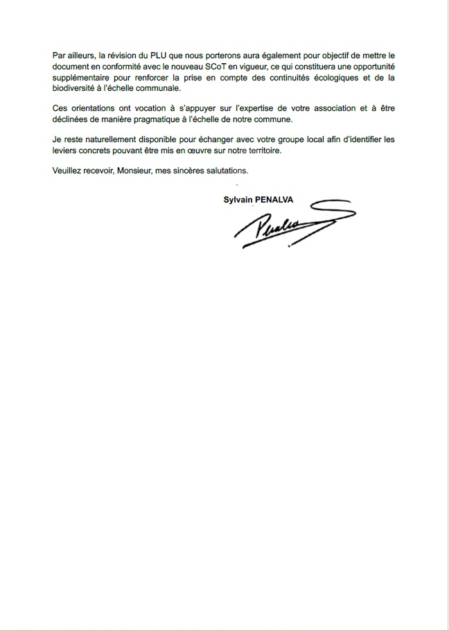 Merci à Monsieur Sylvain Penalva pour sa réponse et ses propositions en faveur de la biodiversité.