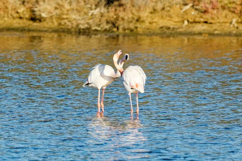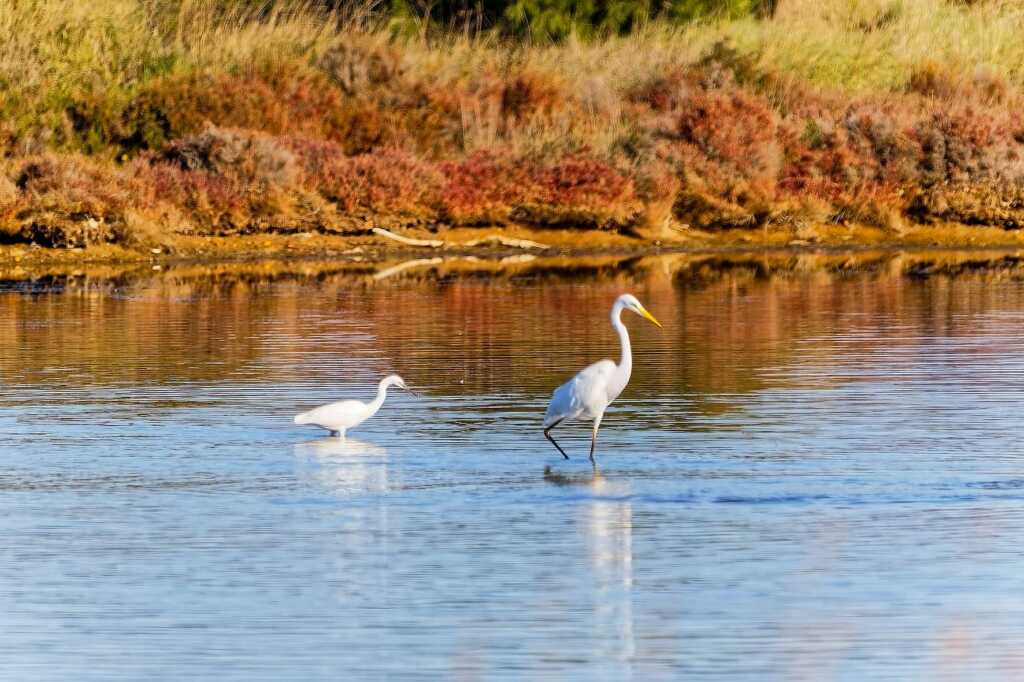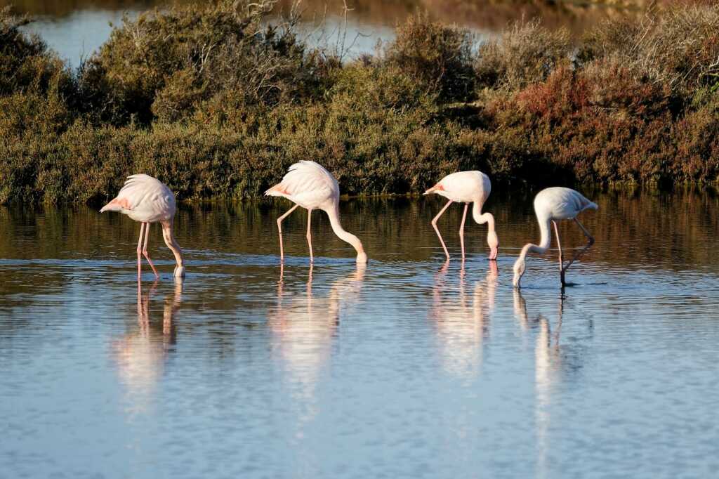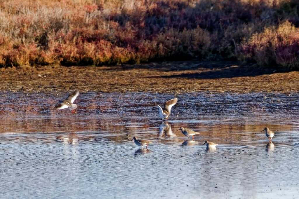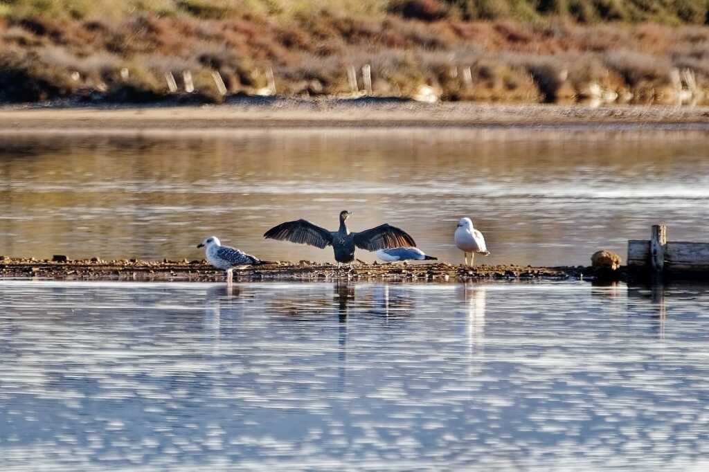 Martin, cormorans, aigrettes (grande et garzette), héron cendré, canards (Belon, sarcelles d’hivers et colvert), courlis (cendré), flamants bien sûr, chevaliers (aboyeur et cul blanc, et un petit groupe de gambettes) et des goéland, mouettes sans oublier les étourneaux, pies, pigeons …