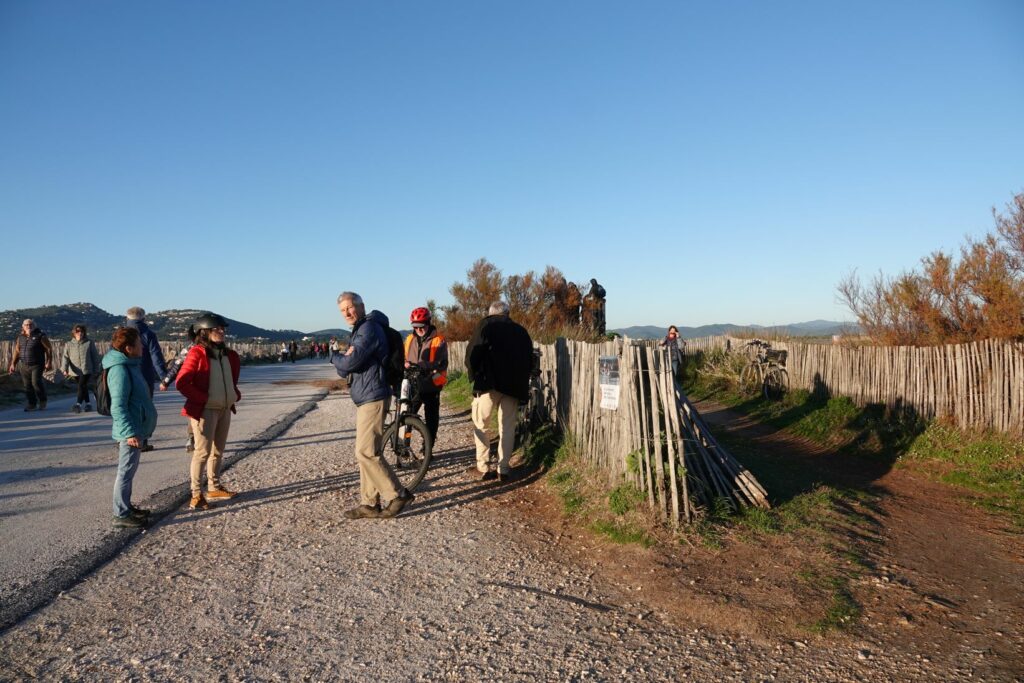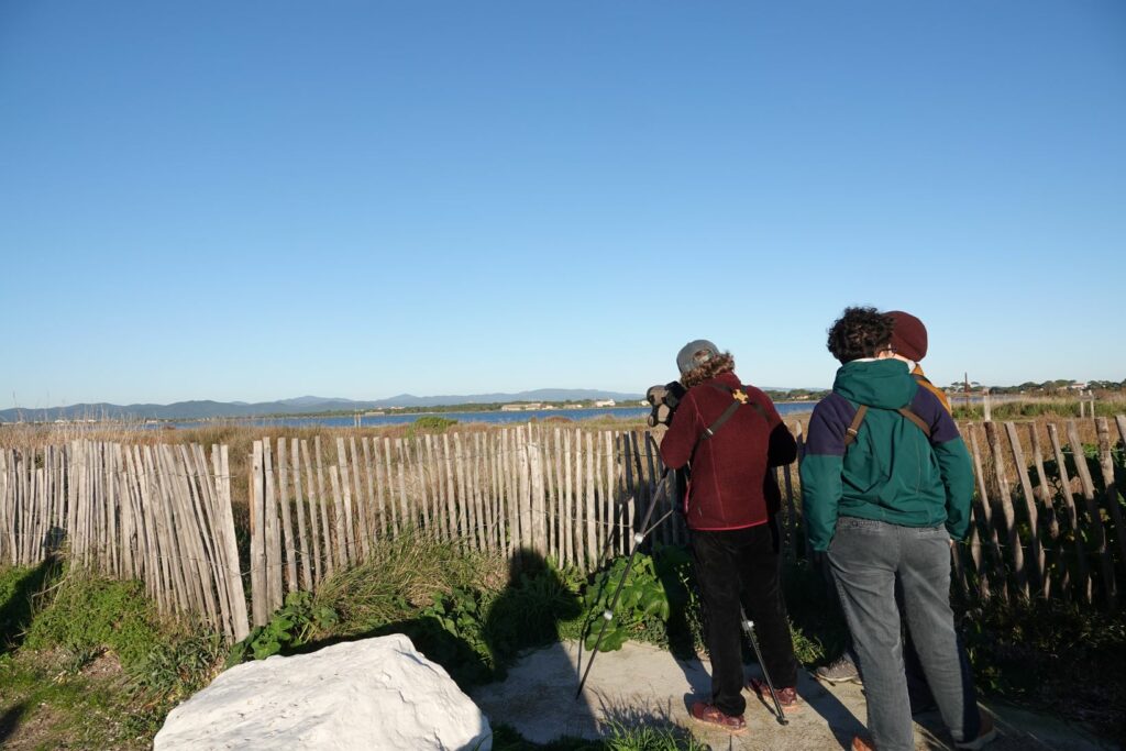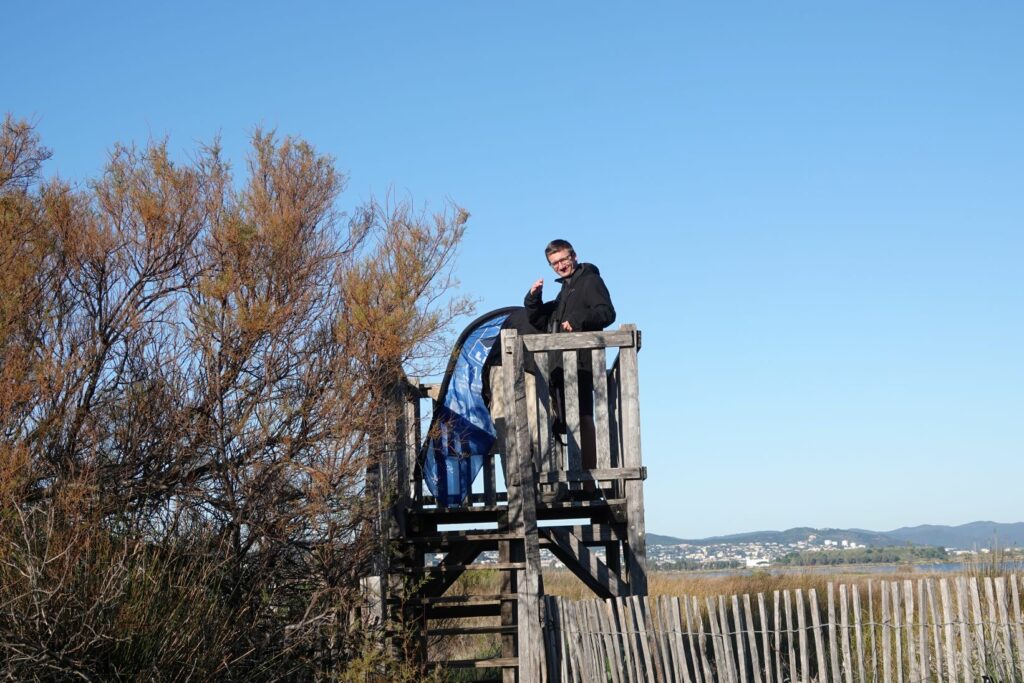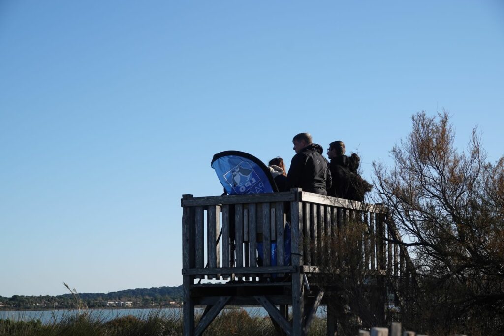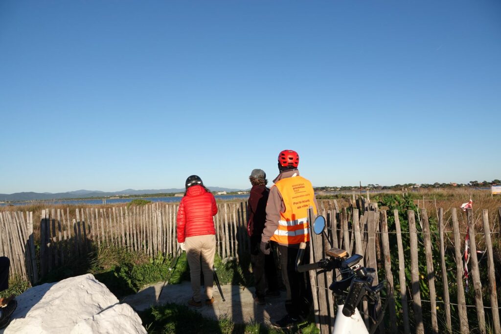 Il faut passer la route inondée pour arriver à l’observatoire, le premier est Benjamin, suivit de Sylvia et Marc puis de Philippe.