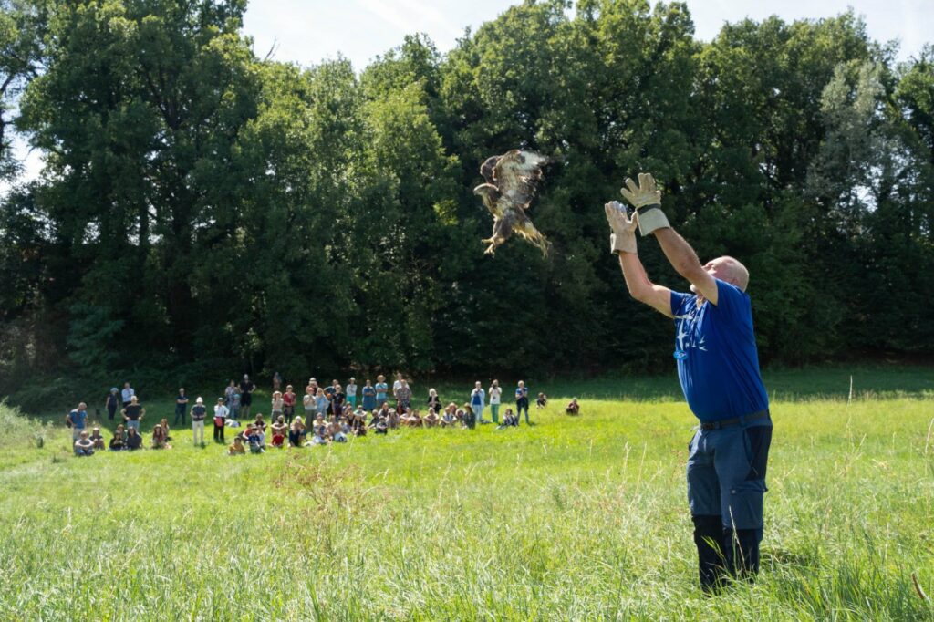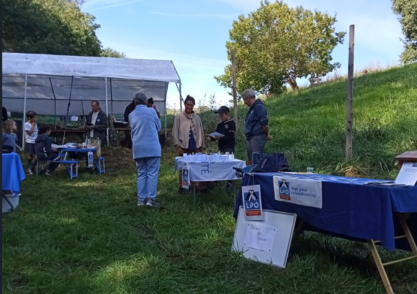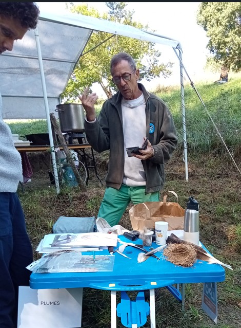 Puis tout le monde s’en va, il reste des stands et des gens bien seuls. Ici des plumes, beaucoup de plumes. Plus loin, des graines, des insectes, des glands : rien de bon pour moi ! Sur une table, des empreintes, des pelotes de réjection, des crottes, des os, pouah ! Uniquement des déchets !Sur une autre table, des photos de becs, des pinces, des tenailles, des poignards… et puis, ça et là, des oiseaux cachés dans les fourrés…