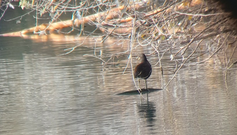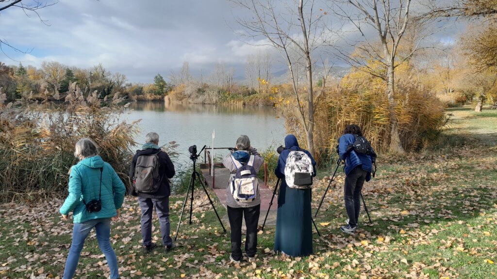 Il n’y a pas beaucoup d’oiseaux ce matin sur les lacs et nous ne sommes que six, mais nous regardons évoluer les Milouins, les Grèbes, les Poules d’eau, nous repérons le Martin pêcheur, si vif, nous nous entraînons aux chants avec la Sittelle, le Pic épeiche et la Bouscarle.