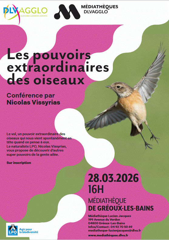 Samedi 28 mars 16 h à la Médiathèque de GREOUX LES BAINS conférence par Nicolas VISSYRIAS «Les Supers Pouvoirs des Oiseaux».