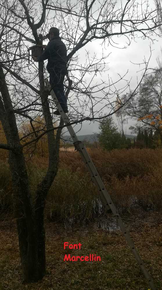 Ce mardi matin, par une belle journée lumineuse mais froide, nous étions sept bien couverts, avec bonnet pour la majorité d’entre nous, et même des gants pour certains, prêts à grimper ou tenir l’échelle pour découvrir ce que nous réservaient les nichoirs du camping…