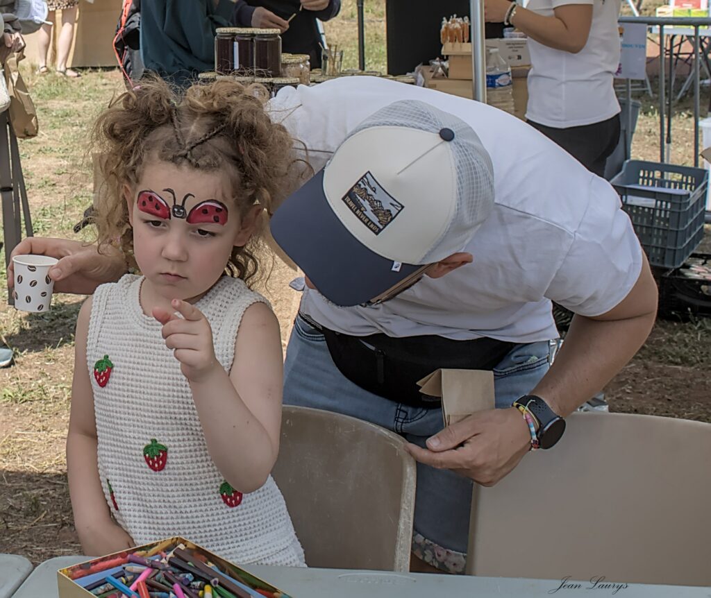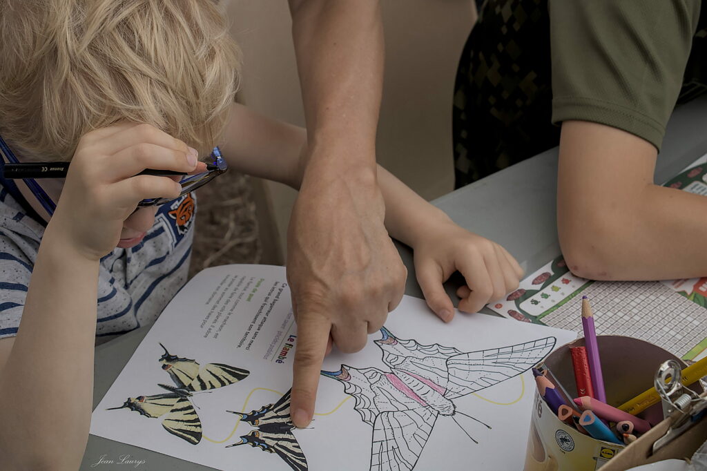 Petits et grands participent à l’atelier « coloriage »; nous y voyons, entre autres : une jolie Coccinelle, une merveilleuse princesse et un bénévole souriant et concentré 🙂