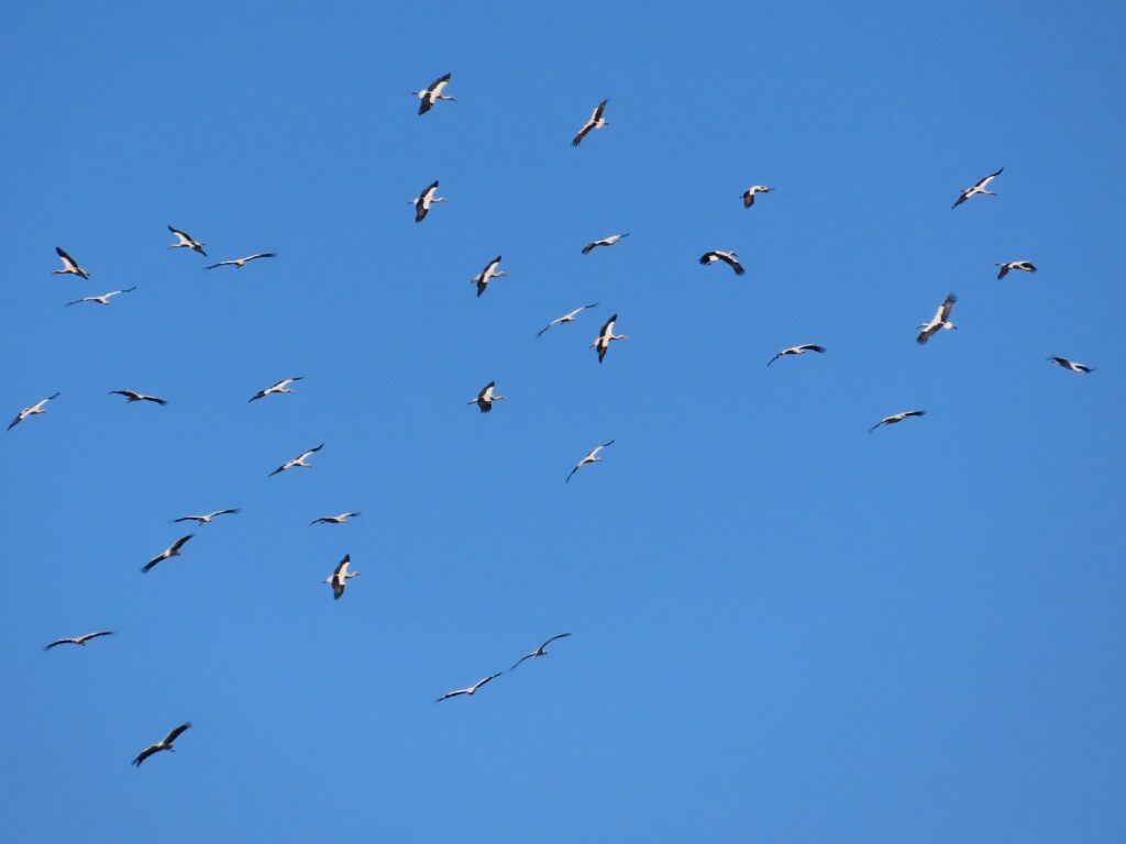 L’après-midi, Christophe et sa famille visiteront un site archéologique. Après un pique-nique, Philippe, eVe et moi-même reprendrons le trajet de la veille. Les oiseaux seront moins nombreux à cause du vent, mais de nouvelles espèces seront aperçues : Bernache nonnette et chevalier arlequin en plumage nuptial. Nous assisterons aussi au va-et-vient des cigognes le bec plein paille pour consolider leurs nids. Crabier chevelu, huppe fasciée, cochevis huppé seront au rendez-vous. 11 km parcourus ce jour.