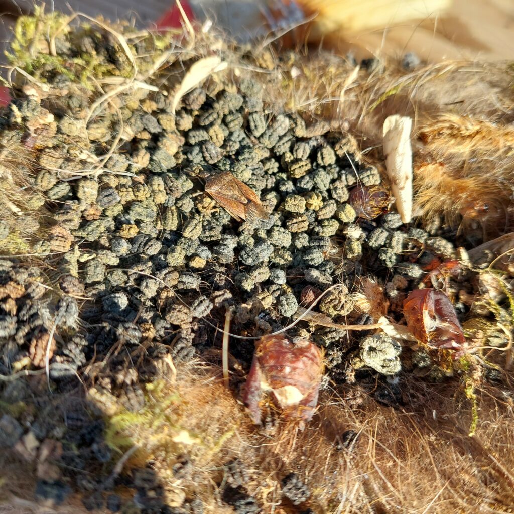 Dans le nid du nichoir n°10, sur un nid de mésange, nous avons retrouvé un amoncellement de petites boules grisâtres que nous n’avons pas identifiées. S’agirait-il des provisions d’un petit mammifère ? La question reste posée…