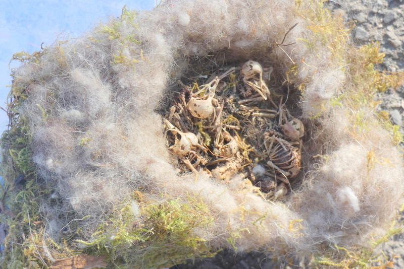 Parmi ces 6, nous avons hélas trouvé 2 nids contenant l’un 5 à 6 squelettes d’oisillons (nichoir n°11) et l’autre avec 2 oiseaux morts dont l’un paraissait être adulte (nichoir n°1).