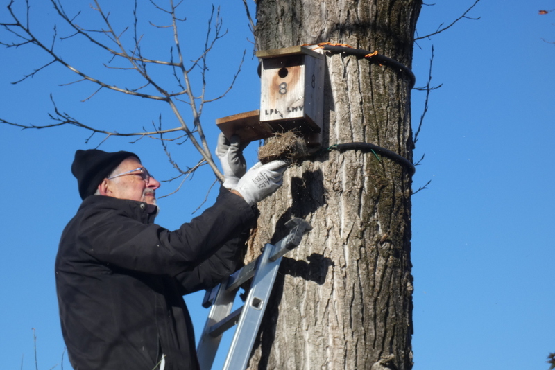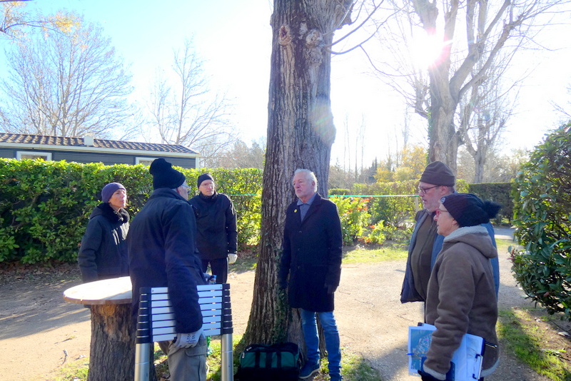 Ce mardi matin, par une belle journée lumineuse mais froide, nous étions sept bien couverts, avec bonnet pour la majorité d’entre nous, et même des gants pour certains, prêts à grimper ou tenir l’échelle pour découvrir ce que nous réservaient les nichoirs du camping…