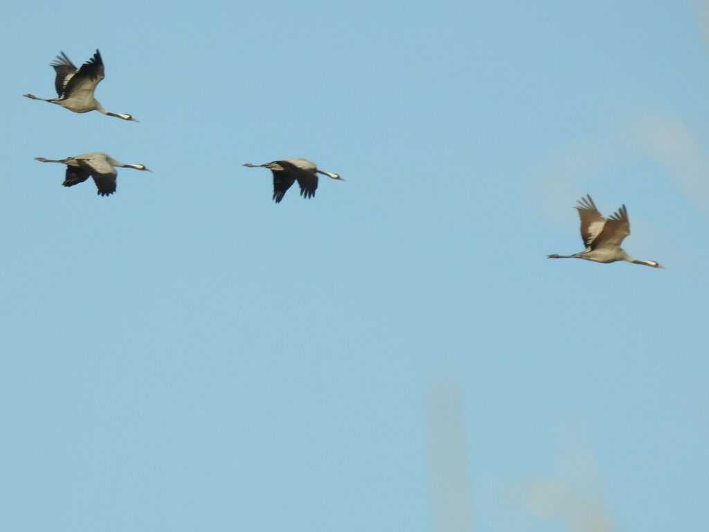 Quelques instants avant d’arriver au parc, nous nous sommes arrêtés pour admirer de nombreuses grues cendrées dans le ciel et les champs environnants.