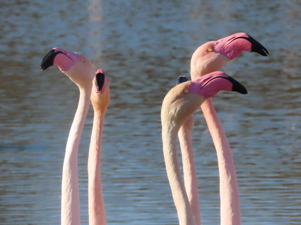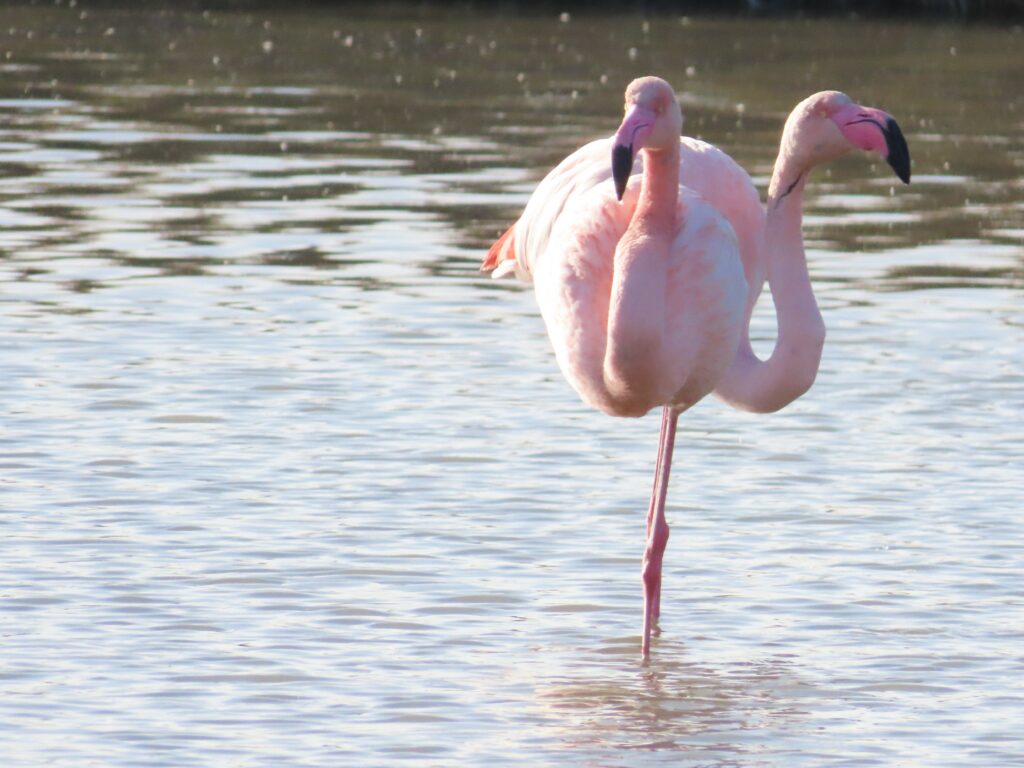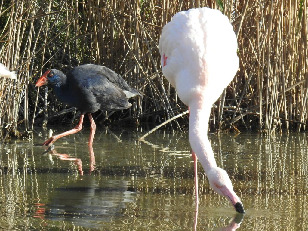 Le long du circuit le plus court, les très nombreux flamants roses commençaient à parader. Nous avons pu observer également une talève sultane, une échasse blanche et un ibis falcinelle, de même que quelques petits passereaux et gros ragondins.