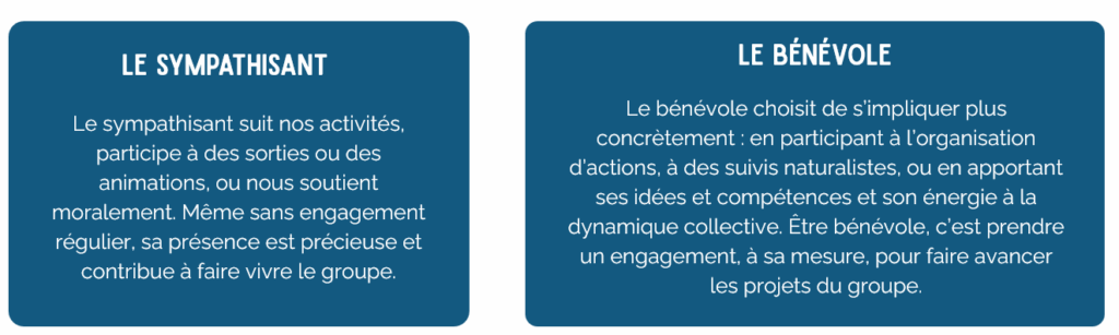 Cette distinction n’est pas une séparation, mais une manière de reconnaître les différentes façons de s’impliquer dans la vie du groupe. Il n’y a pas de bonne ou de mauvaise manière de participer. Ce qui compte, c’est l’envie d’agir pour la nature, ensemble.