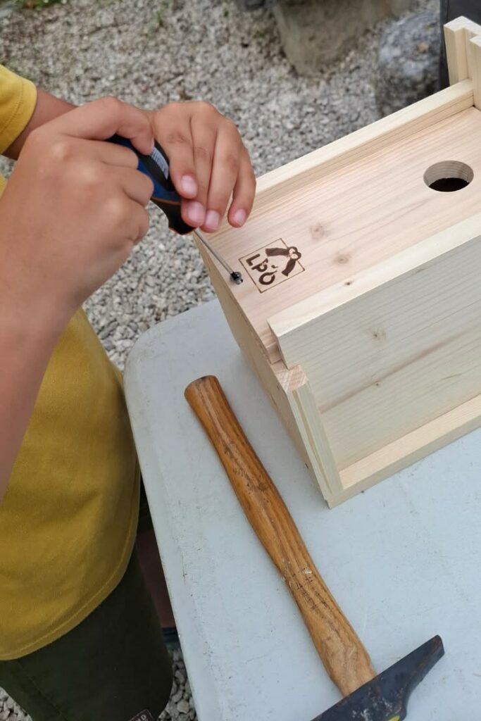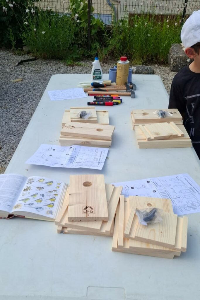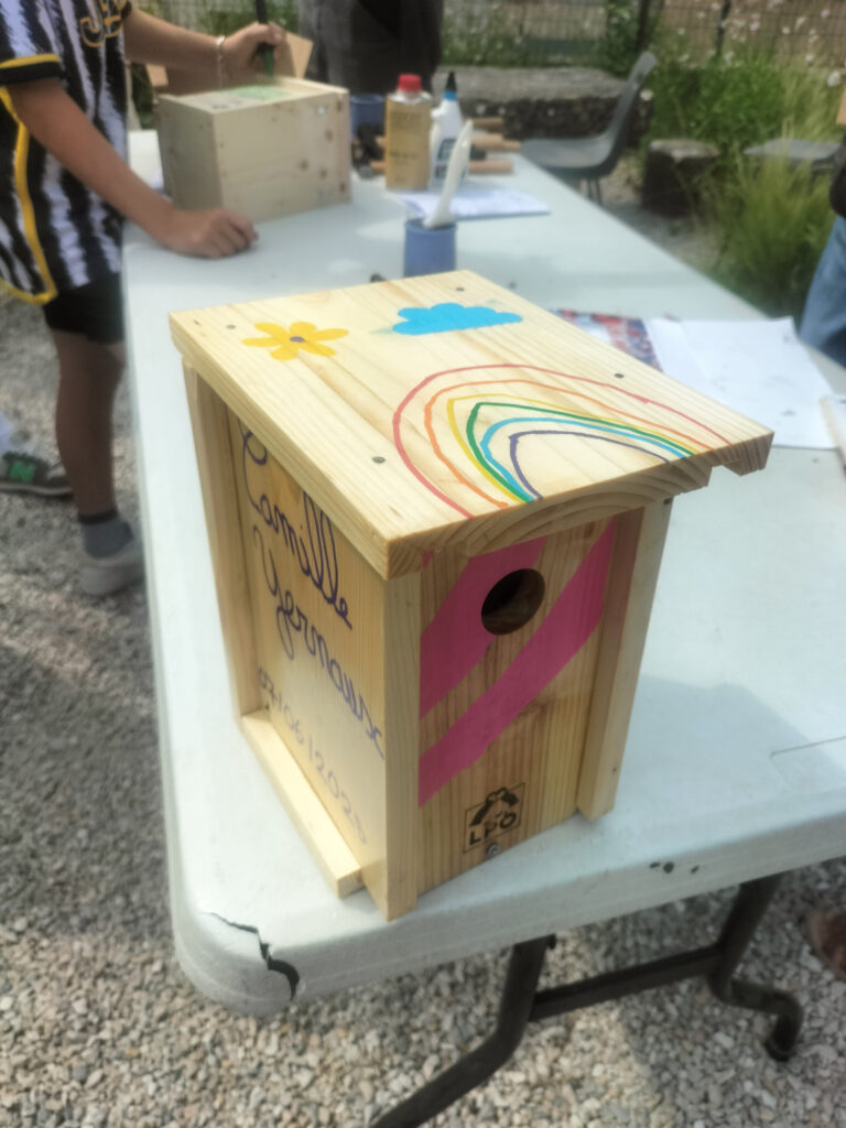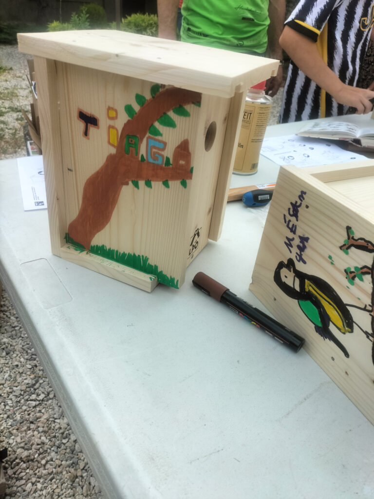 Après avoir collé, cloué, vissé dans la joie et l’enthousiasme, les enfants ont pu librement décorer leur nichoir. Bravo les artistes! Une dernière couche d’huile de lin et tous et toutes ont pu repartir avec leur précieux abri.