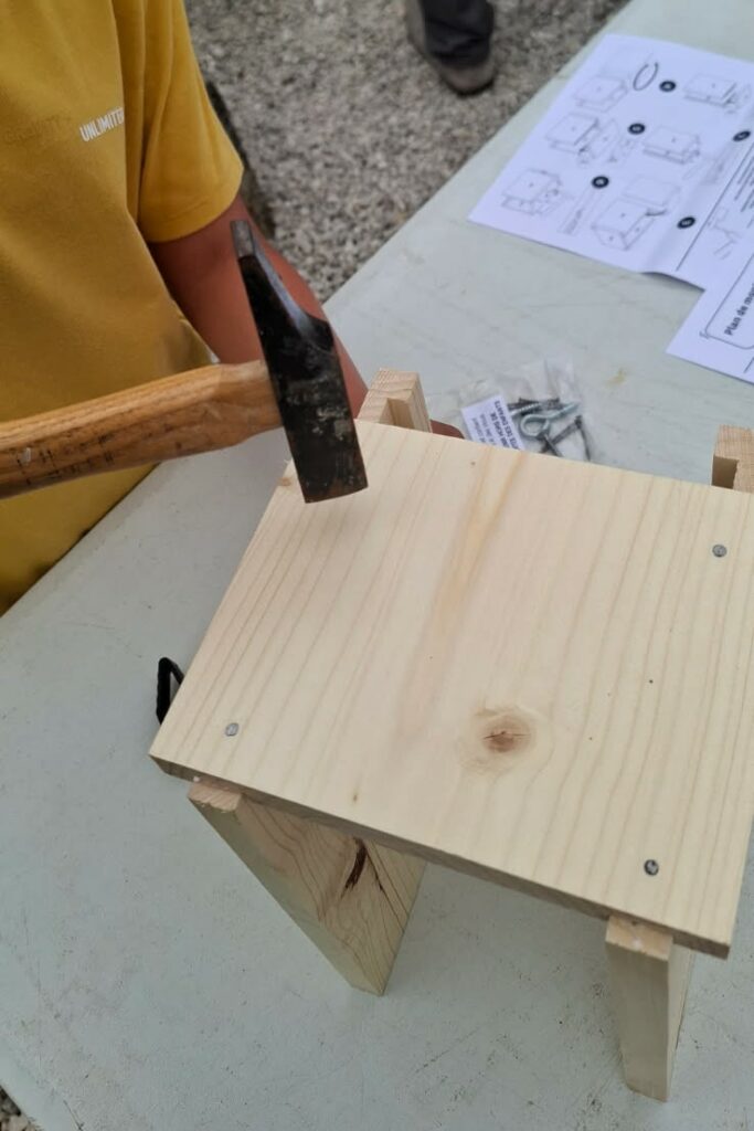 C’est donc ce samedi 7 juin à 9h00 que RV fut pris dans le jardin de la bibliothèque. Après une brève présentation (notamment sur l’utilisation des nichoirs) et un échange chaleureux avec les 6 familles présentes, la fabrication put démarrer, encadrée par Cécile et moi même. Barbara de la Bibliothèque ainsi que Philippe Boisson et Dany Morel (du groupe de suivi des Mésanges de la Cédraie du Ventoux) venus en observateurs, ont également apporté leur aide et conseils pour monter les 7 kits commandés (6 enfants + 1 pour la bibliothèque).