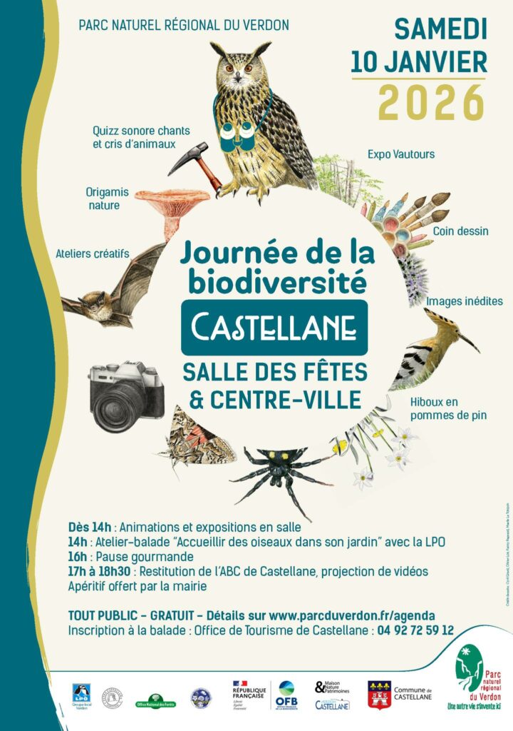 Samedi 10 janvier 2026, la commune de Castellane nous propose une après-midi autour de la biodiversité, avant d’assister à la restitution de l’atlas de la biodiversité à 17h pour (re)découvrir la diversité de la faune et la flore de notre commune !